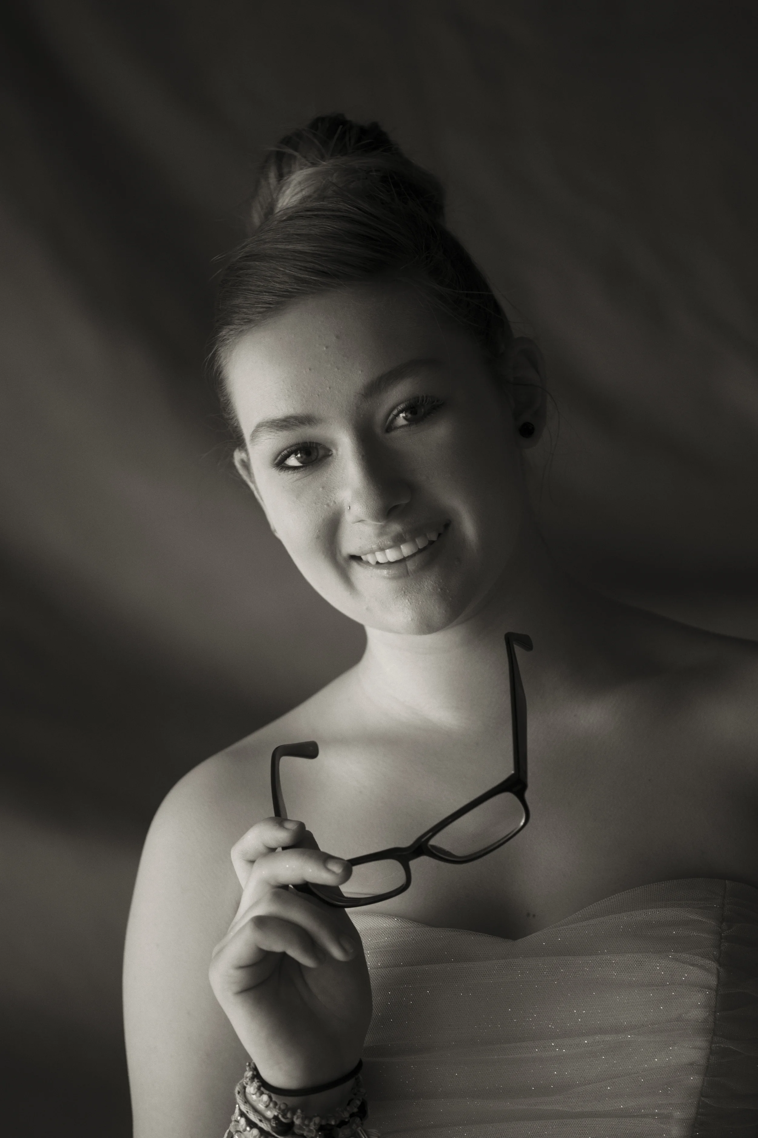 Also, here is an example of what I call garage door lighting. Using the top of the garage door is the same thing in that it also acts as a subtractor of light. Garage door light is terrific and can be used by anyone almost anytime of the day as long as the direct sun is not coming into the garage on the subject. Here I have used a background to simulate studio portrait but created it without the use of any lights.