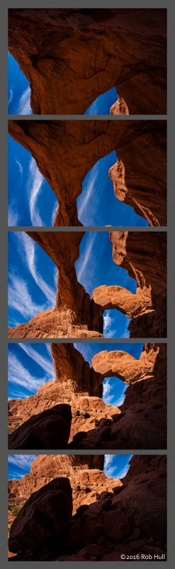 Five frames used to create a stitched panoramic photograph of Double Arch. The bottom image is directly in front of me and slightly below. The top image is directly behind me level with the horizon. Over 180° from one end to the other.