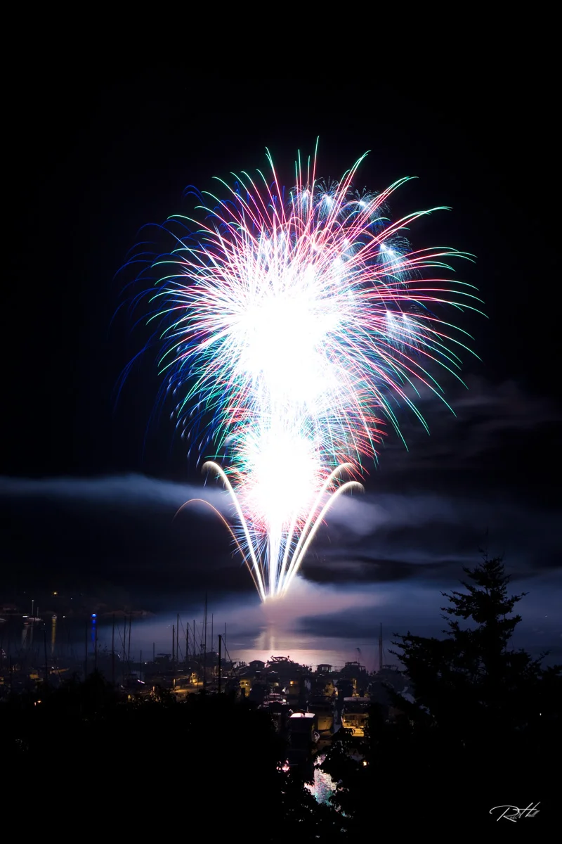 The key to successfully capturing fireworks images with rich colors is to really understand precisely what it is your’e shooting and setting your exposure accordingly. Fireworks are made up of burning embers that are flying through the air. The individual embers can be quite colorful and very bright. For many, their first attempt at photographing fireworks results in over exposed white trails.